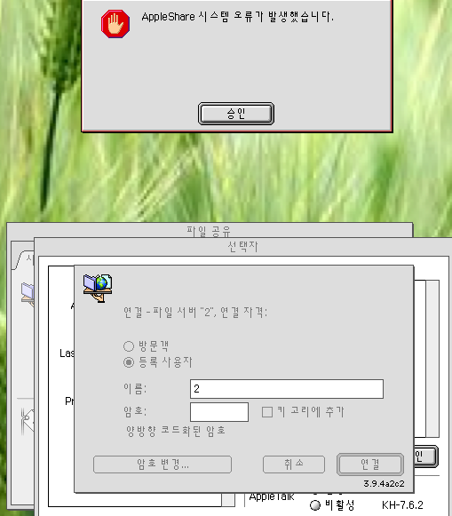AppleShare 에러의 원인은 주로 로그인 시에 소유자 이름을 틀리게 기입을 하거나, 애플쉐어 관련 파일들의 환경이 엉켜 있을 경우입니다.