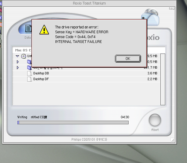 Toast에서 시디 굽는데 자꾸 에러 메세지가 뜨네요..