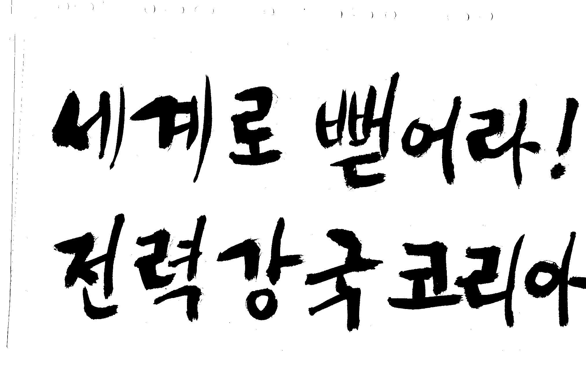 캘리 좀 부탁드려요!~ 김철호 일반 1 10893 2008.12.24 12:09 > > > > > 전력회사 신문광고를 하는데요 캘리로 멋지게 하고픈데 > > 캘리프로그램으로 아무리 써도 느낌이 안나옵니다 ㅜ.ㅜ > > 이런걸 부탁한다는 자체가 너무나도 염치없지만 부탁드립니다. > > > > 세계로 뻗어라! 전력강국 코리아 > > > 보기는 쉬워도 하기는 어려운게 > 세상 모든 일 일겁니다. > 그중에 캘리그라피가 그런것 일 겁니다... > 스캔중에 글꼴이 잘린것은 서로다른글꼴서 편집하시길... > 글수가 많아서 어쩔 수없네요... >